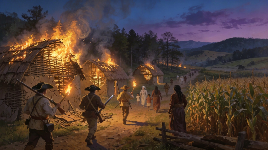 The militia burned a chain of Cherokee settlements—towns such as Keowee, Estatoe, Tugaloo, and others—along with their cornfields and food stores, breaking organized resistance in the Lower Towns by late summer 1776. In September, Williamson coordinated with North Carolina forces deeper in the mountains, and together they destroyed additional Middle and Overhill towns, leaving much of the Cherokee Nation devastated as winter approached.