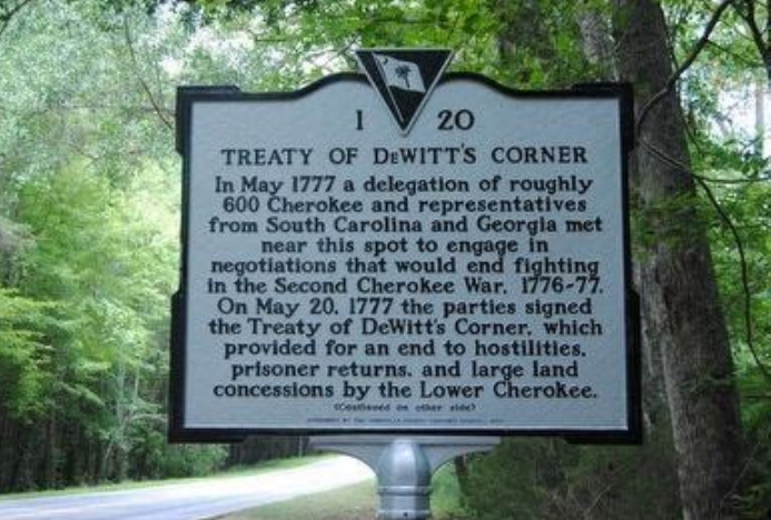 By the Treaty of DeWitt’s Corner in 1777—in what is now Abbeville County—the Cherokee ceded large tracts of land in present-day Upstate South Carolina and agreed to peace, though frontier tension and smaller raids continued.