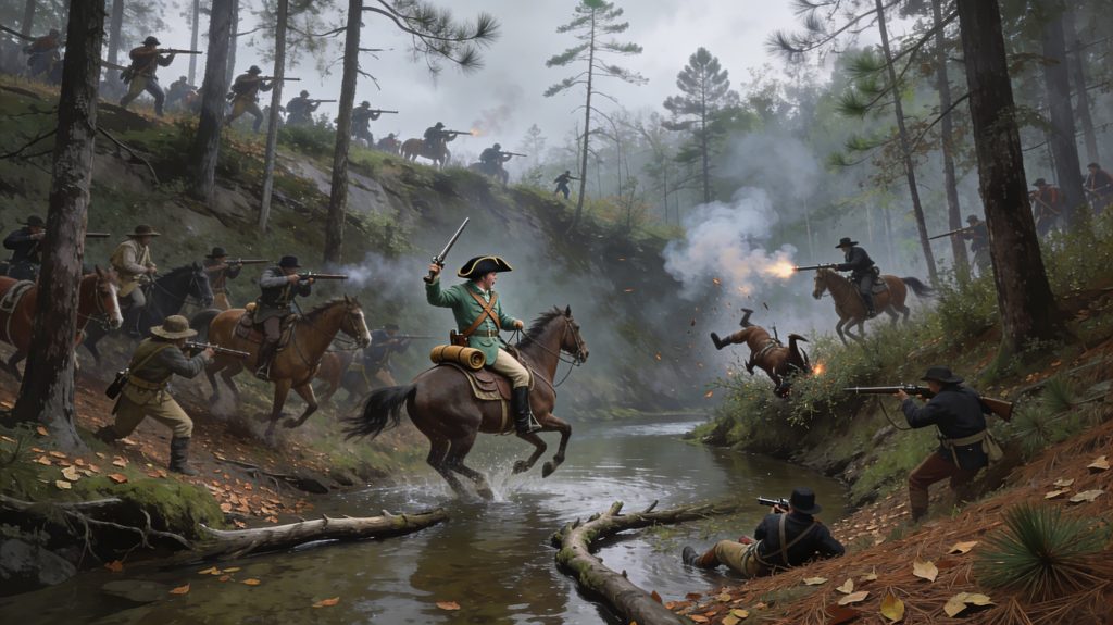 The opening shot fractured the quiet hollow. The sentry toppled from his horse into the brush. For a heartbeat the Loyalists hesitated; then the clearing erupted with motion. Radcliffe wheeled, shouted orders, and raised his carbine. His men scrambled for such cover as the banks and scattered trees allowed, firing as they ran. Bullets clipped branches and hummed through the scrub around Turner’s line.