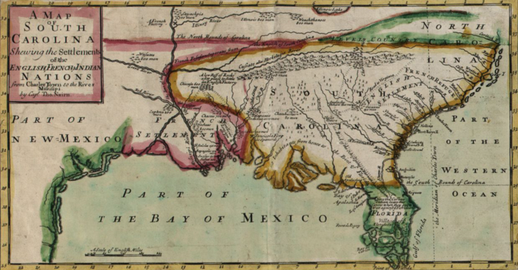 The Yamassee War was one of the bloodiest conflicts in colonial British America, and it almost destroyed the Carolina project. After burning farms, destroying plantations and killing around 400 colonists2 – at least 7% of the South Carolina population at the time – the Yamassee were finally defeated and driven southward into Florida. The Creeks signed a peace treaty with the Carolinians in 1717 and moved westward into Georgia and Alabama. On the outskirts, though, those tribes continued their war with the Cherokee.