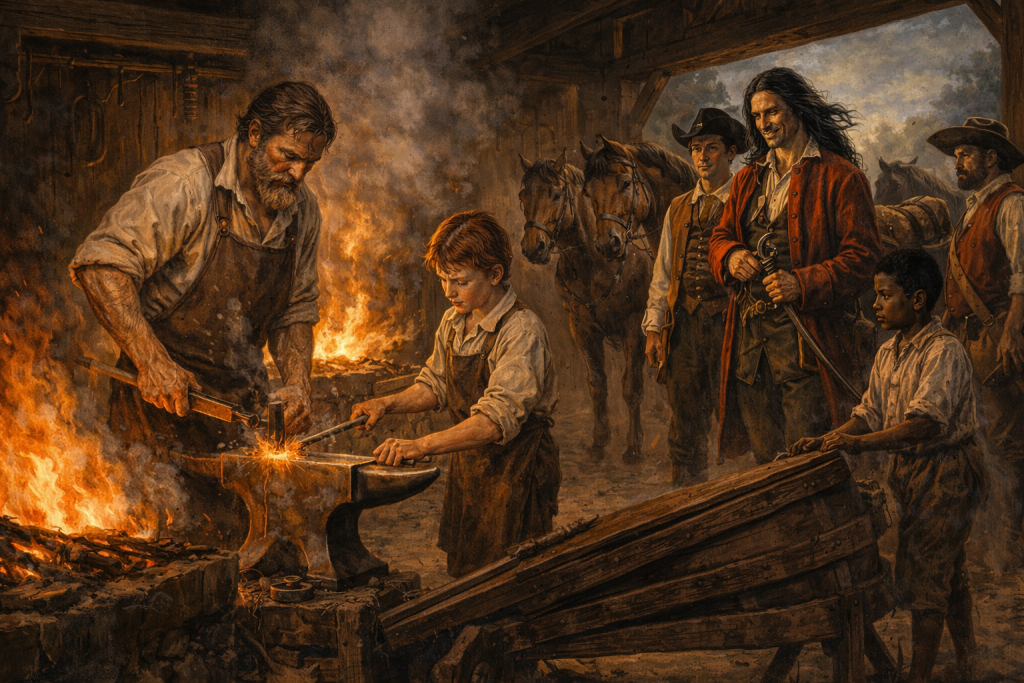 A few miles farther they reached the blacksmith shop of John’s brother, Oliver Towles, whose son was with him. Towles shod several of the Loyalists’ horses. As soon as he was done, the smith and his son were dragged out and murdered alongside an enslaved boy who worked the forge.