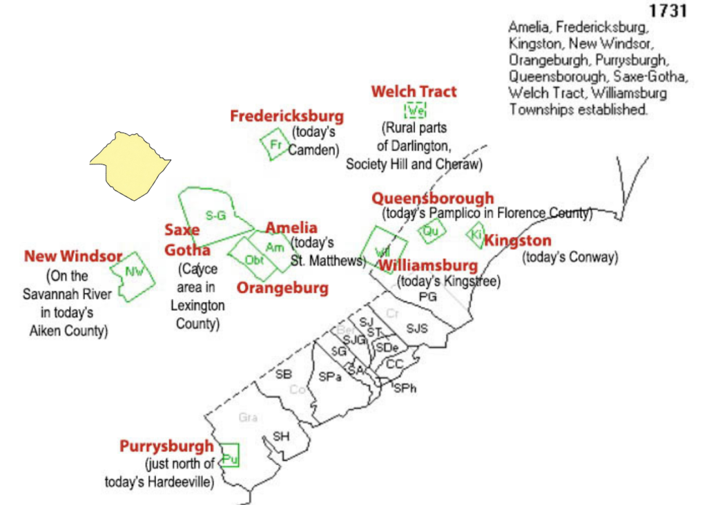 In 1731, Robert Johnson, became the first Royal Governor after South Carolina had officially become a Royal Colony in 1729. Upon the vast lands ceded to the Crown in the Treaty of 1721, he laid out nine townships. A tenth, the Welch Tract, was added soon after.
