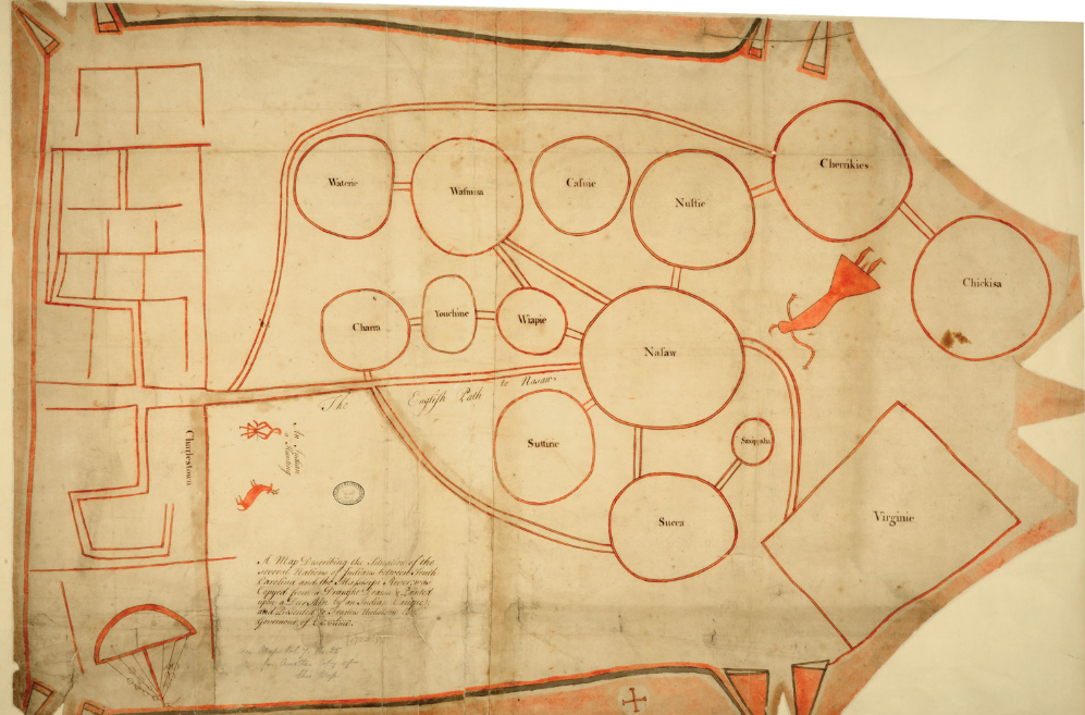 - The map is called “The Catawba Deerskin Map,” though some scholars believe it was drawn by a Cherokee. The original deerskin did not survive, but paper copies were drawn at the time, and some are still in existence. ↩︎