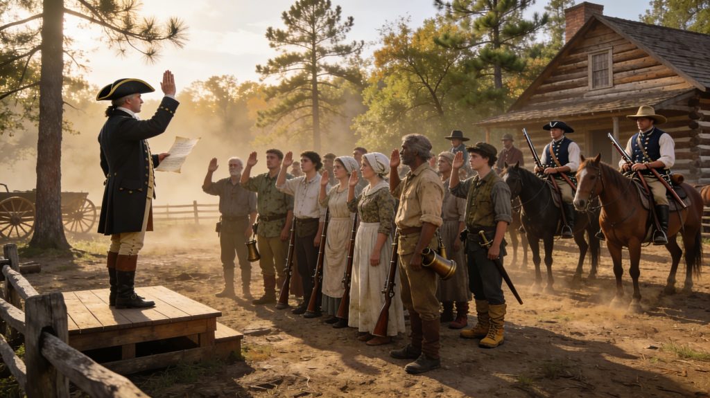 William, still too young for formal commission, served as a private when called, learning the backcountry arts of ambush and rapid withdrawal. On those same patrols, Butler’s men sometimes carried the duty of oath enforcement — presenting themselves at the farms of men who had not yet pledged, watching as neighbors were pressed to declare themselves before God and community.