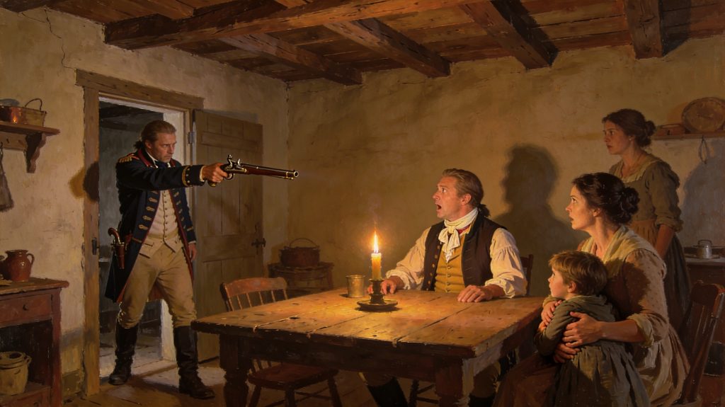 Word came from home that a Patriot officer, Captain William Ritchie, had ridden to my father’s place with a party of Whigs. They stormed into the house, cursed my people as Tories, and set about proving their power. My father was terrorized, threatened in his own dwelling. My brother—sickly and weak, and no threat to anyone—was taken out and lashed like a hardened criminal. The beating was so savage that he never rose from it. They flogged an invalid to death in the name of their cause.